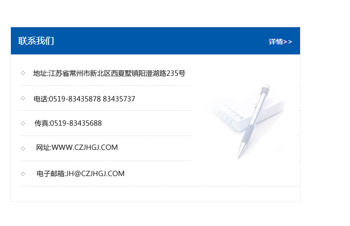 地址:常州市新北區友邦商務大廈1幢16、17層  電話:0519-85101652  傳真:0519-85112595  郵編:213022  網址:www.cz-jiayue_cn.rykmm.com  郵箱:xiajifengaa@163.com